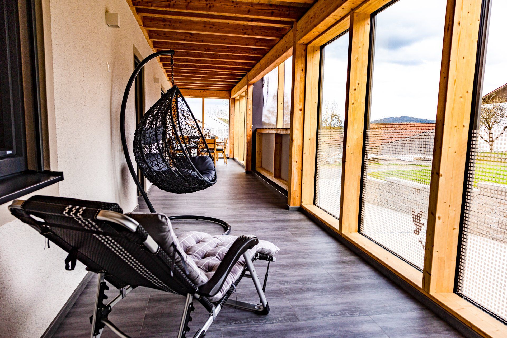 Der Balkon ist mit einer Eckbank und Tisch, mit einem Zweisitzer und 2 Liegen ausgestattet. Der Balkon ist zu 80% verglast, als Wind- und Regenschutz, so dass man auch bei schlechtem Wetter draußen sitzen kann. Die restliche Fläche ist mit einem Insektenschutzgitter ausgespannt, damit der Balkon fliegen- und insektenfrei bleibt.